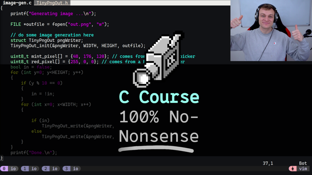 After finishing it, you’ll understand all my C videos, read my code effortlessly, and write serious C programs yourself.
